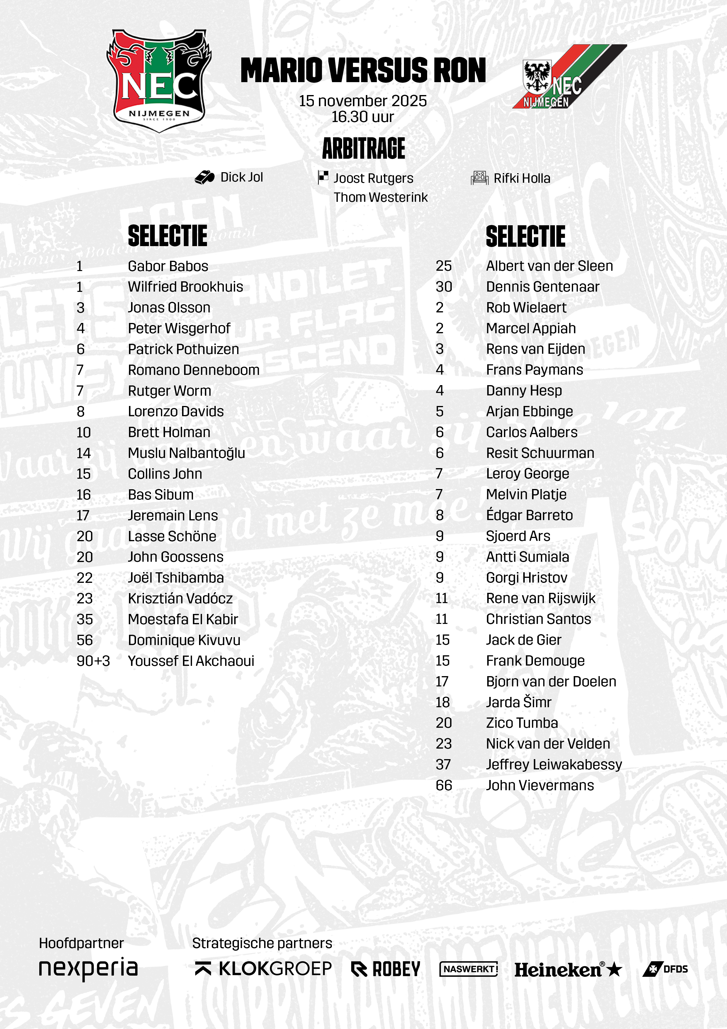 Zaterdag 15 november bestaat N.E.C. 125 jaar. En zoals je ongetwijfeld al hebt meegekregen, vieren we dat met de jubileumwedstrijd Mario vs Ron. De wedstrijd wordt omlijst met een goedgevuld programma, zowel binnen als buiten het Goffertstadion. In dit bericht bereiden we je optimaal voor op de wedstrijd.