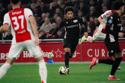 De Nijmegenaren leken na een kwart wedstrijd aan de andere kant van het veld de score te openen, maar Ahmetcan Kaplan gaf zijn assist op Sami Ouaissa vanuit buitenspelpositie. Kaplan was later nog twee keer gevaarlijk: een kopbal belandde op de paal, de ander werd miraculeus van de lijn gehaald door Youri Regeer. Waar N.E.C. de kansen liet liggen, sloegen de Amsterdammers vijf minuten voor rust wel toe. Mika Godts profiteerde optimaal van balverlies van Kodai Sano: 1-0.