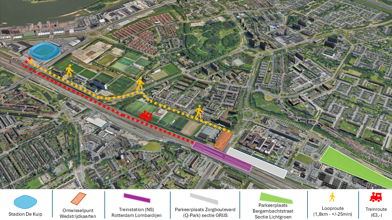 Nadat je je ticket hebt omgewisseld, neem je voor € 3,- de trein vanaf Rotterdam Lombardijen (naast het parkeerterrein) naar De Kuip. De reistijd bedraagt circa vier minuten. Zie de NS Reisplanner voor de exacte tijden van de versterkte NS-dienstregeling tussen Rotterdam Lombardijen en Rotterdam Stadion. Ook na de wedstrijd rijden er extra treinen terug naar Rotterdam Lombardijen.