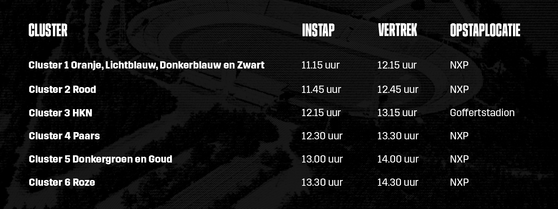 Houd je ticket en identiteitskaart bij de hand om de instroom bij de parkeerplaats te versnellen. In bovenstaande tabel staan de opstaplocaties per cluster genoteerd. Alle clusters keren terug op de NXP-opstaplocatie. De parkeerplaatsen (auto en fiets) zijn in de buurt van de NXP-opstaplocatie.